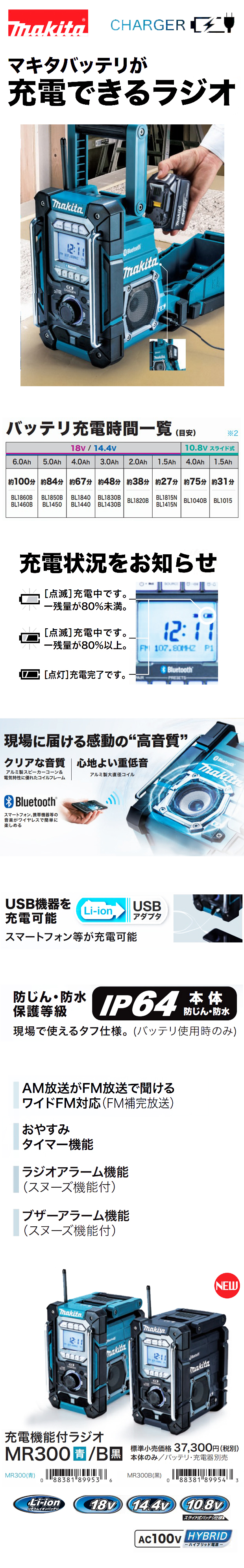 マキタ、makita、充電機能付ラジオ、充電器、充電式ラジオ、MR300、MR300B、スマホ対応、マキタバッテリー、Bluetooth、高音質、スピーカー 大阪日本橋「柴商」