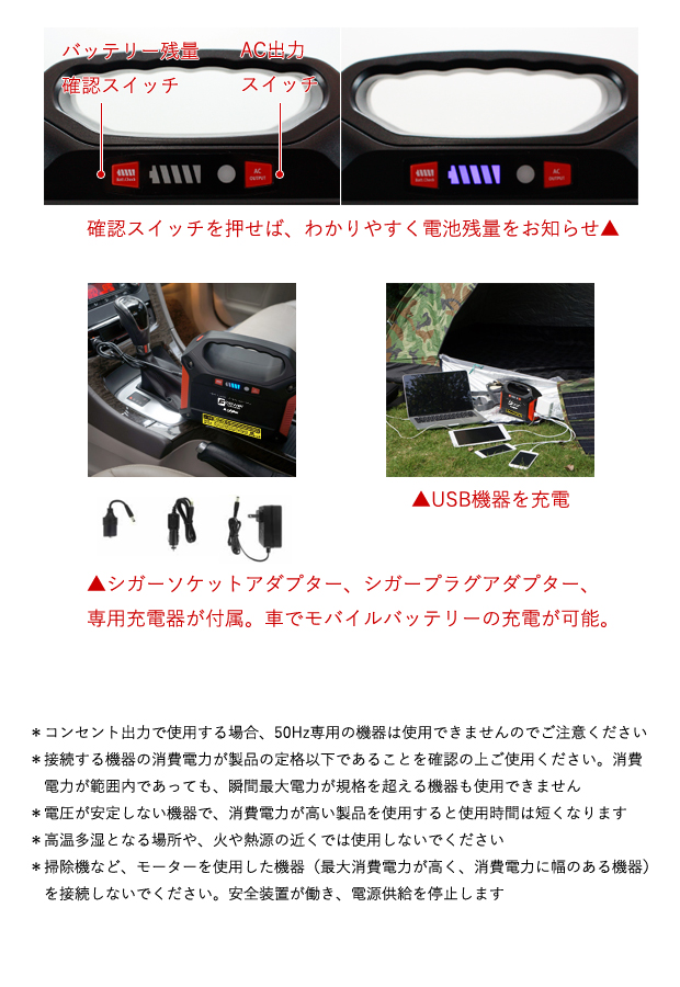 【その他仕様】電池残量メーター・残量表示スイッチ・AC出力表示・AC出力ON/OFFスイッチ・LEDライト・カーチャージャー・シガーソケットアダプター・ACアダプター(別売のソーラーパネルを利用すると電源の無い場所でも充電ができます。)