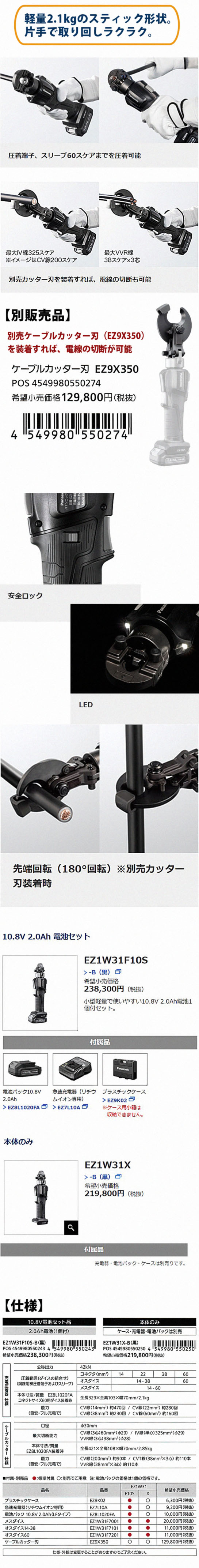 panasonic、10.8V、コードレス、充電式、パナソニック、EZ1W31F10S-B、EZ1W31X-B、EZ9X350、圧着器 大阪日本橋「柴商」